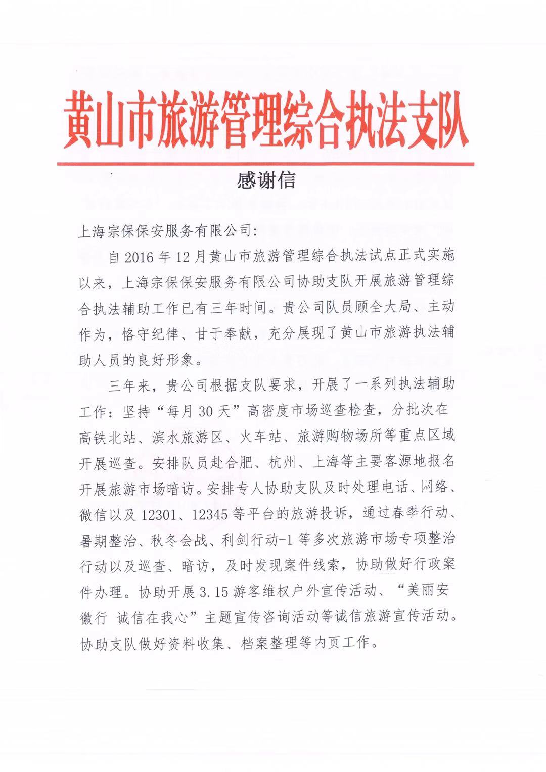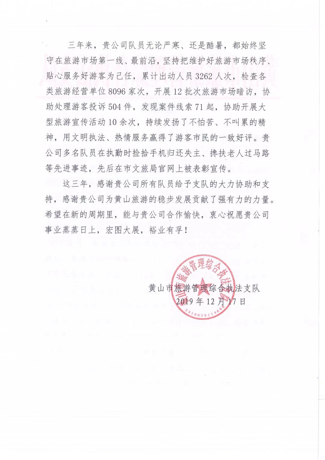 2019年12月17日,公司收到黃山市旅游管理綜合執(zhí)法支隊(duì)送來(lái)的錦旗和表?yè)P(yáng)信。這是2019年公司收到的第51面錦旗和第27封表?yè)P(yáng)信。