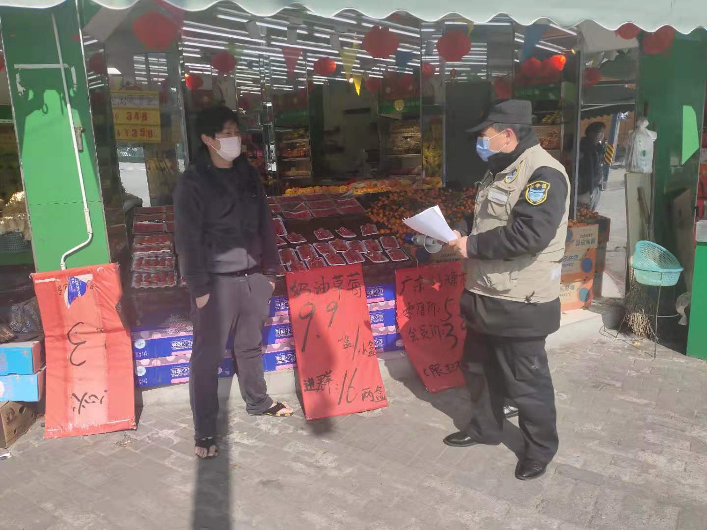 在疫情防控中,康建鋒除了完成日常工作外,配合民警維持市民藥店門口購買防護(hù)用品排隊(duì)秩序。