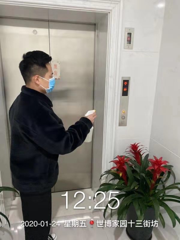 疫情防控中,胡康威配合甲方檢測(cè)進(jìn)入小區(qū)人員體溫,排查疫區(qū)來(lái)滬人員,每天對(duì)公共區(qū)域進(jìn)行消毒。