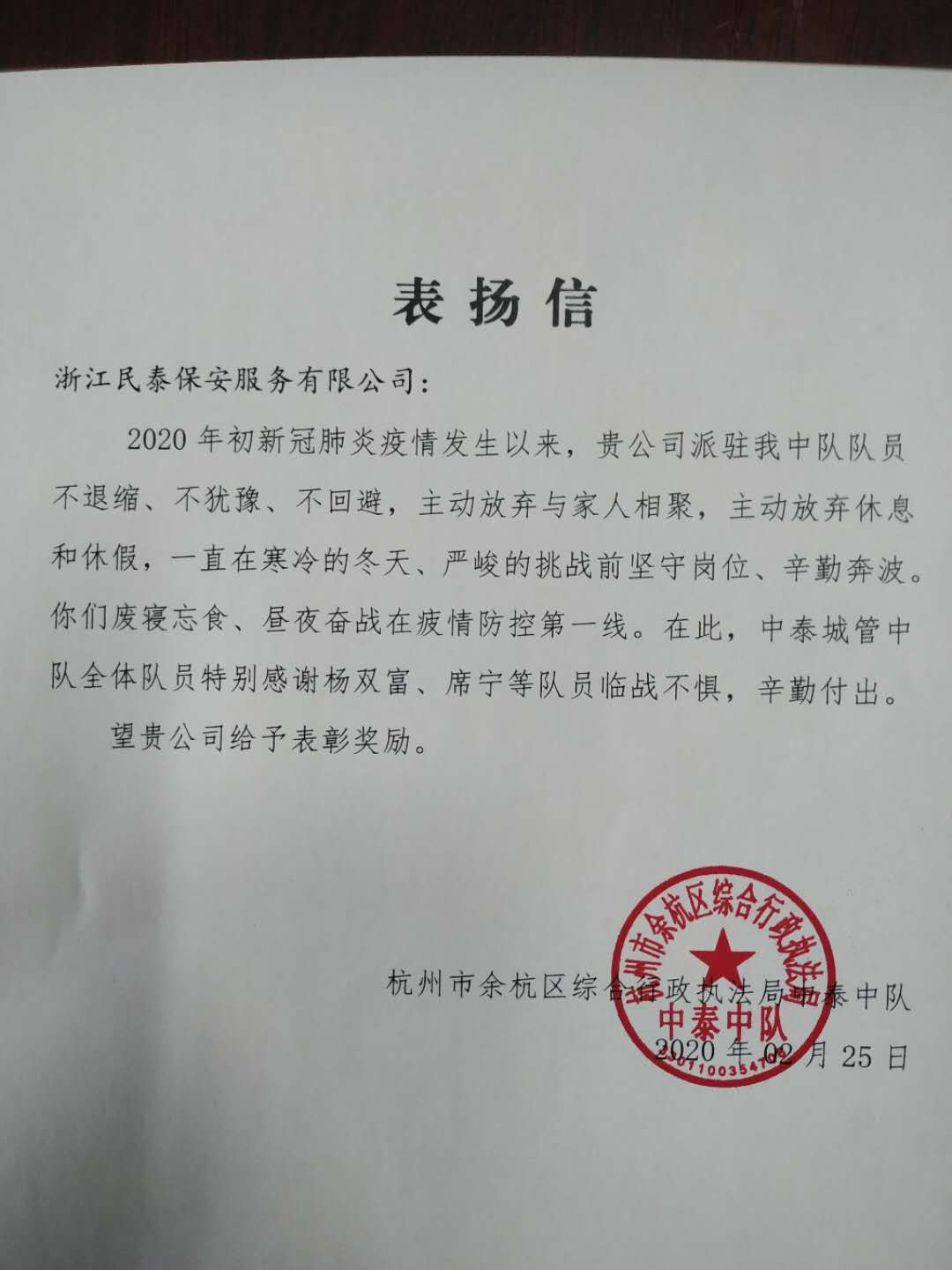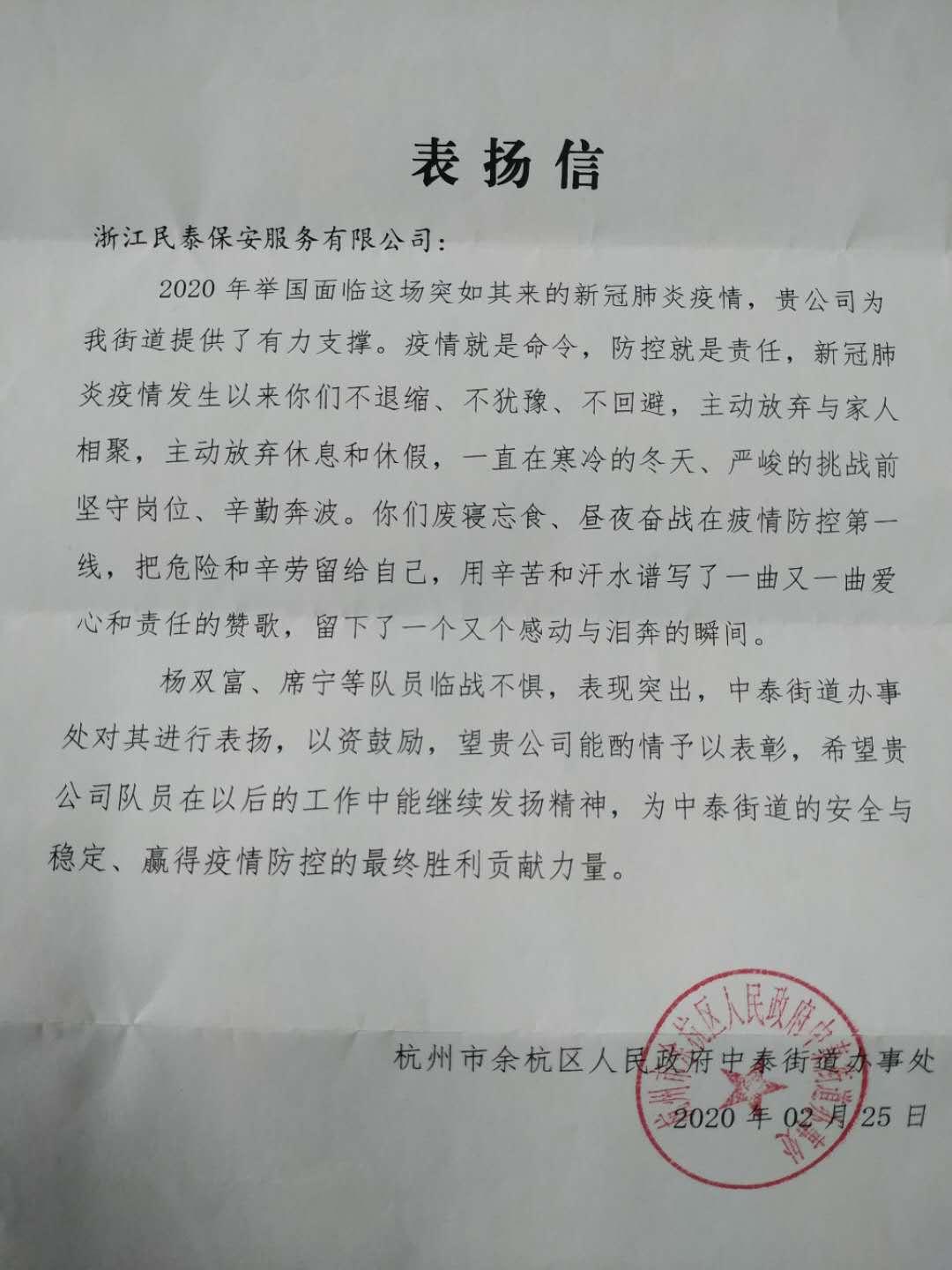 2月25日,杭州市余杭區(qū)中泰街道辦事處和該街道城管隊(duì)分別送來(lái)表?yè)P(yáng)信,表?yè)P(yáng)浙江民泰公司駐該街道城管項(xiàng)目全體隊(duì)員在疫情防控中的工作表現(xiàn),點(diǎn)名表?yè)P(yáng)楊雙富、席寧兩名隊(duì)員。