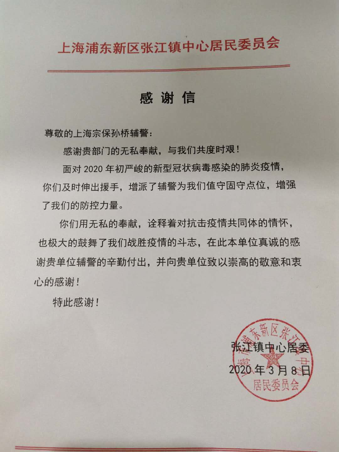 3月8日,張江鎮(zhèn)中心居委送來表揚信,表揚公司駐孫橋輔警項目全體隊員,感謝宗保公司在這次疫情防控中及時伸出援手,增派輔警力量值守固定崗位,增強防控力量。