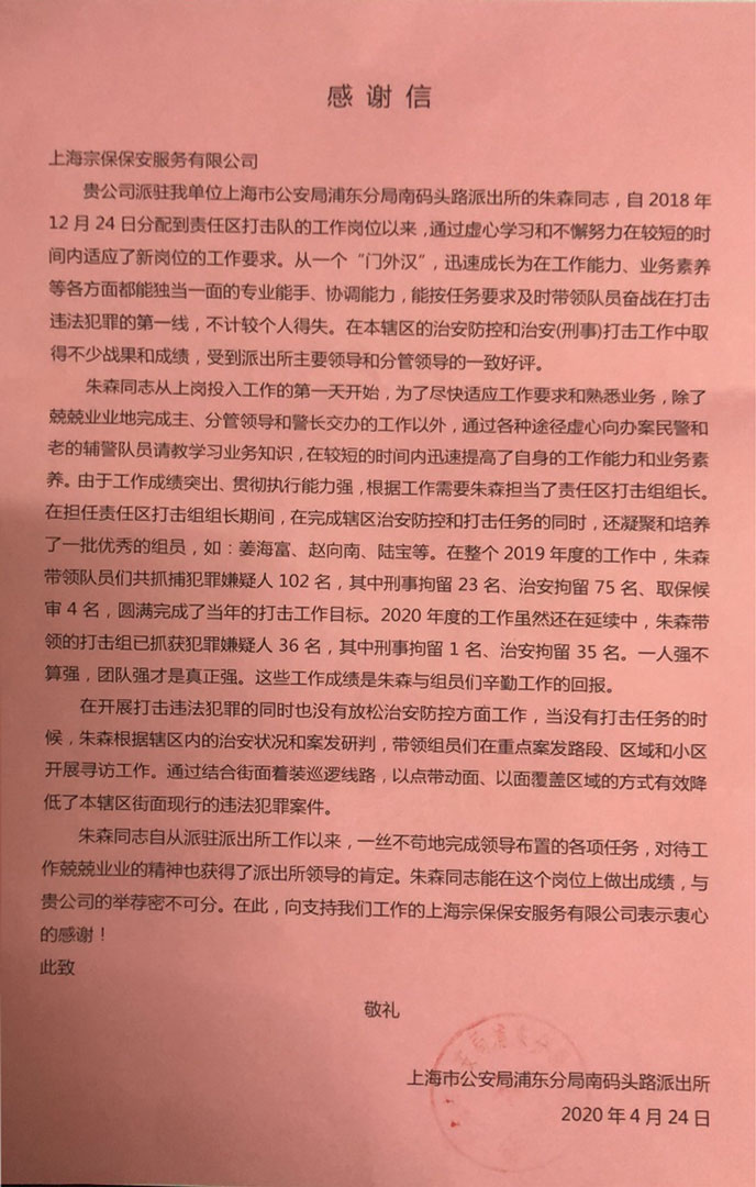 4月24日,宗保公司駐南碼頭派出所輔警項(xiàng)目收到浦東新區(qū)南碼頭派出所送來(lái)的感謝信,信中對(duì)該項(xiàng)目責(zé)任區(qū)打擊組組長(zhǎng)朱森提出特別表?yè)P(yáng)。
