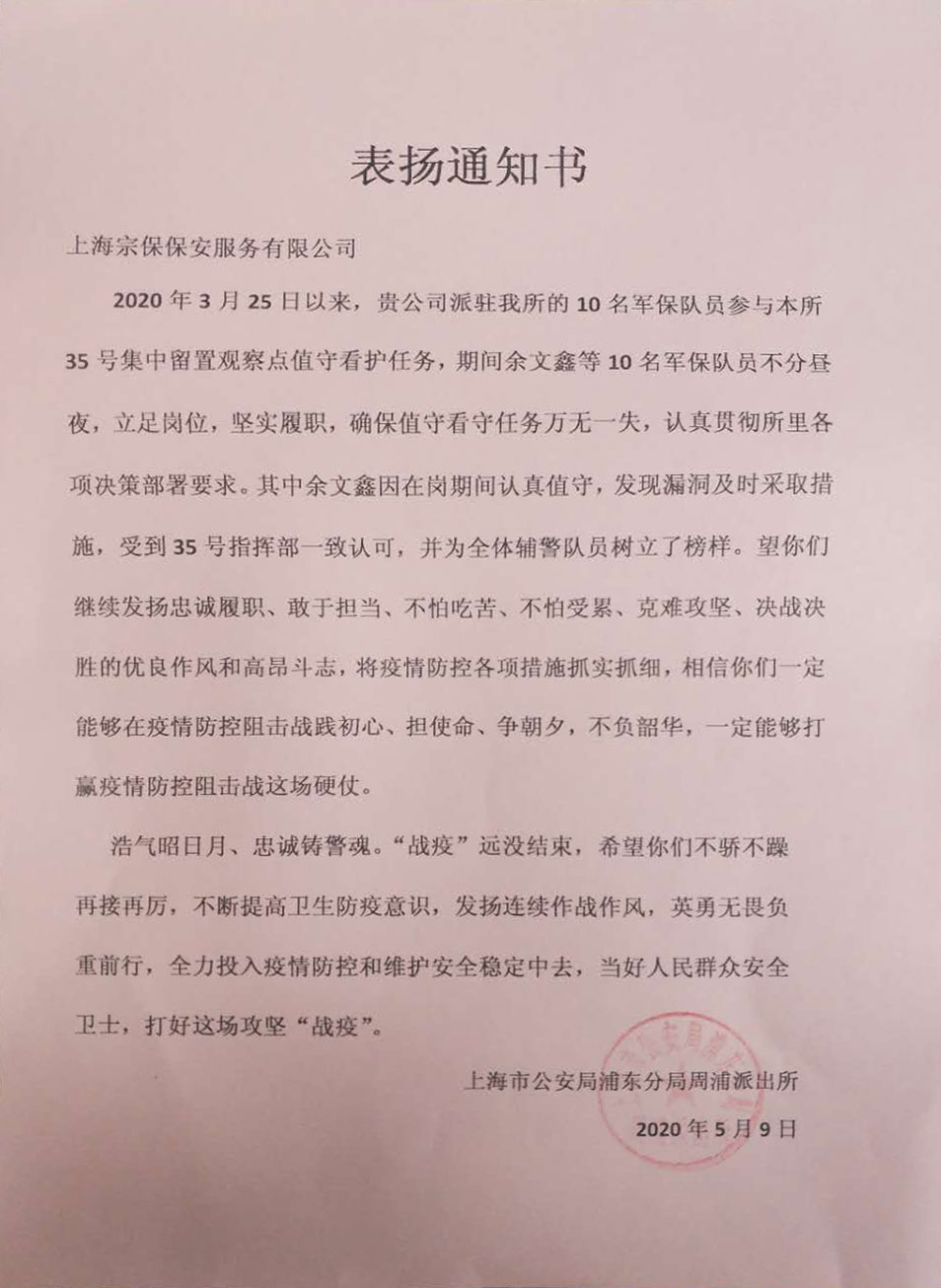 5月9日,宗保公司駐周浦派出所輔警項(xiàng)目收到周浦派出所送來(lái)的一封表?yè)P(yáng)信,信中對(duì)在疫情防控期間參與第35號(hào)集中留置觀察點(diǎn)值守看護(hù)工作的隊(duì)員提出表?yè)P(yáng)。