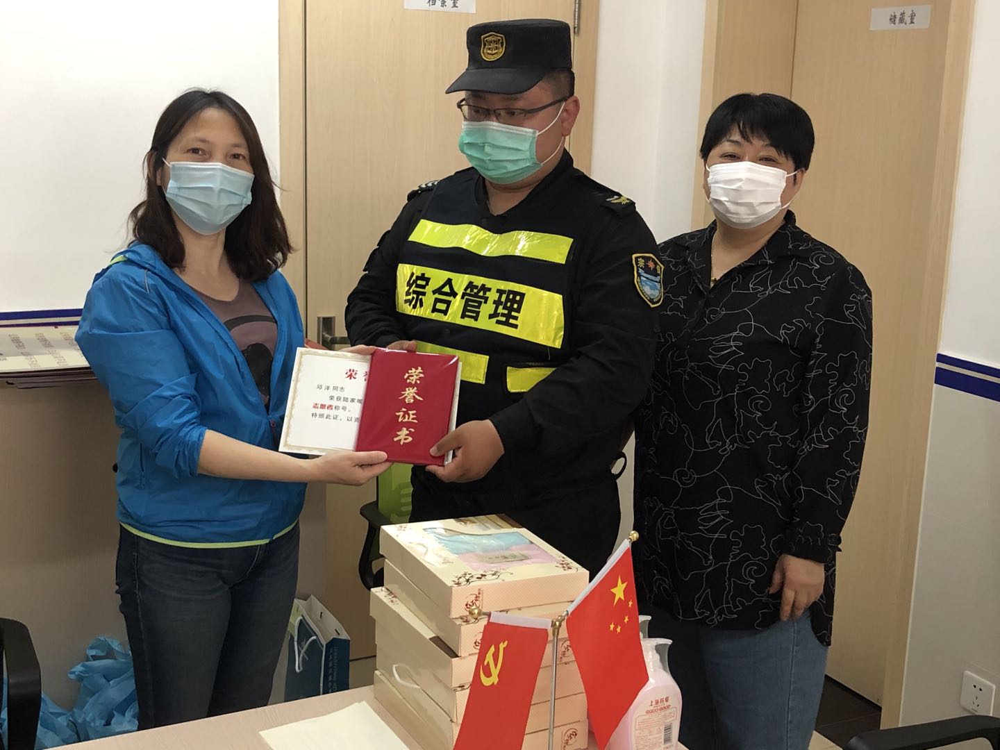 5月13日下午,陸家嘴街道乳山二村的居委書記代表陸家嘴街道黨工委,為在此次疫情防控期間工作表現(xiàn)優(yōu)異被評(píng)選為街道疫情防控工作的優(yōu)秀志愿者、宗保公司駐陸家嘴東昌聯(lián)勤站負(fù)責(zé)人鄧洋頒發(fā)榮譽(yù)證書。