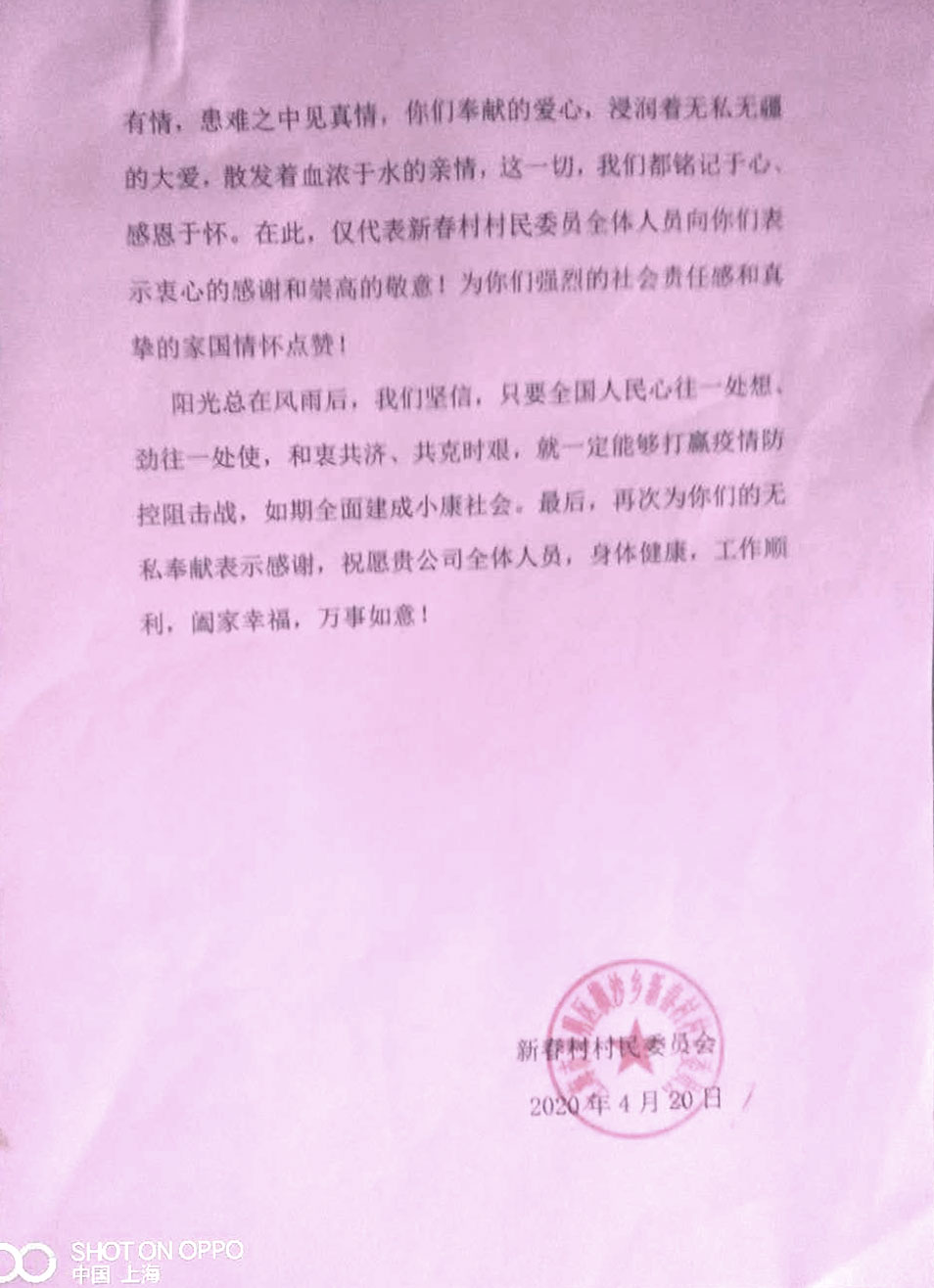 4月20日,宗保公司駐崇明橫沙市容項(xiàng)目收到橫沙鄉(xiāng)新春村村委會(huì)送來(lái)的感謝信,信中對(duì)在疫情期間支援新春村疫情防控工作的隊(duì)員們表示感謝。