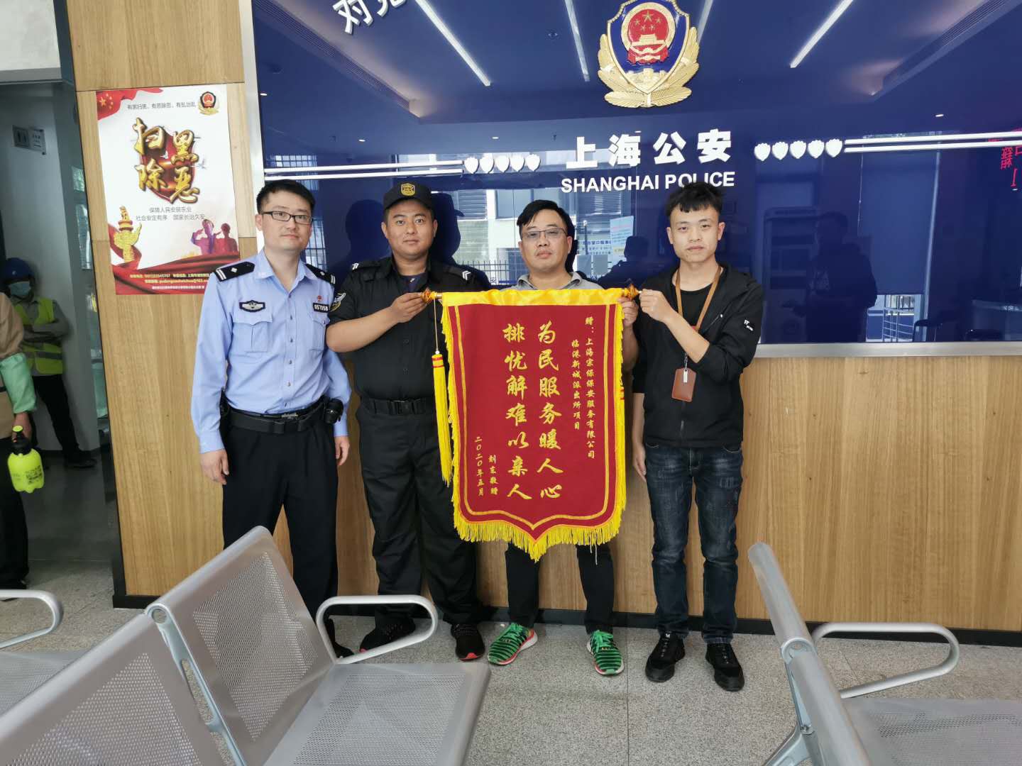 近日,宗保公司駐臨港派出所輔警項目收到市民劉先生送來的一面繡有“為民服務暖人心,排憂解難似親人”的錦旗,對該項目輔警隊員李奎江再三感謝,并主動要求合影留念。
