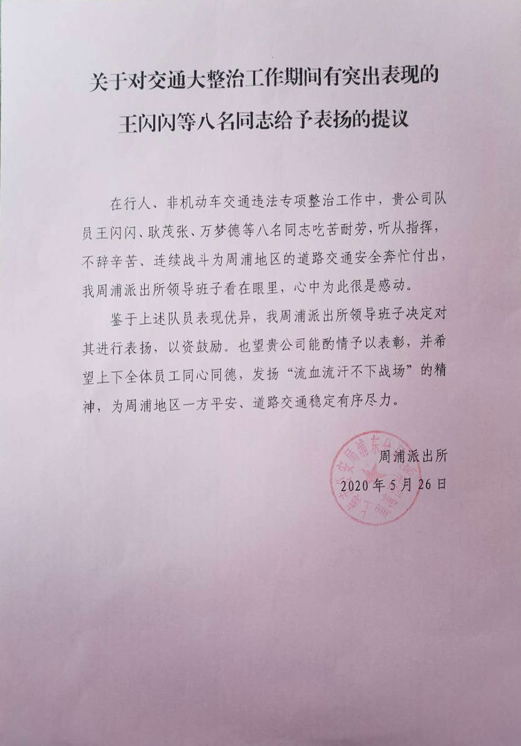 5月26日,宗保公司駐周浦派出所輔警項目收到甲方表揚信。信中對在行人、非機動車交通違法專項整治活動中,表現(xiàn)優(yōu)秀的王閃閃、耿茂張、萬夢德等八名隊員提出特別表揚。
