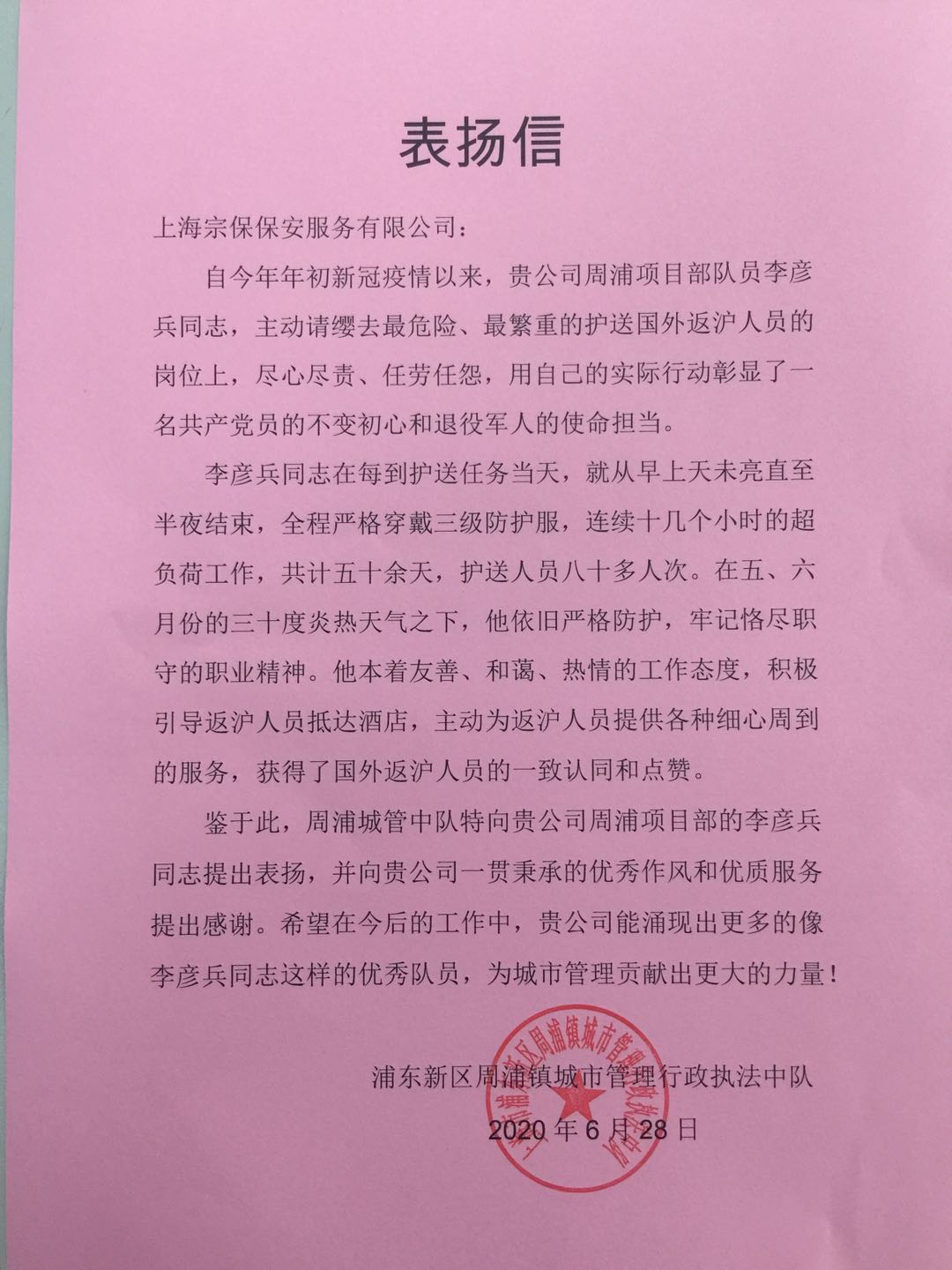 6月28日,宗保公司駐周浦市容項(xiàng)目收到周浦鎮(zhèn)城市管理行政執(zhí)法中隊(duì)送來(lái)的一封表?yè)P(yáng)信,信中對(duì)周浦市容項(xiàng)目隊(duì)員李彥兵提出表?yè)P(yáng),并對(duì)宗保公司提供的優(yōu)質(zhì)服務(wù)和隊(duì)員展現(xiàn)的優(yōu)良作風(fēng)表示感謝。