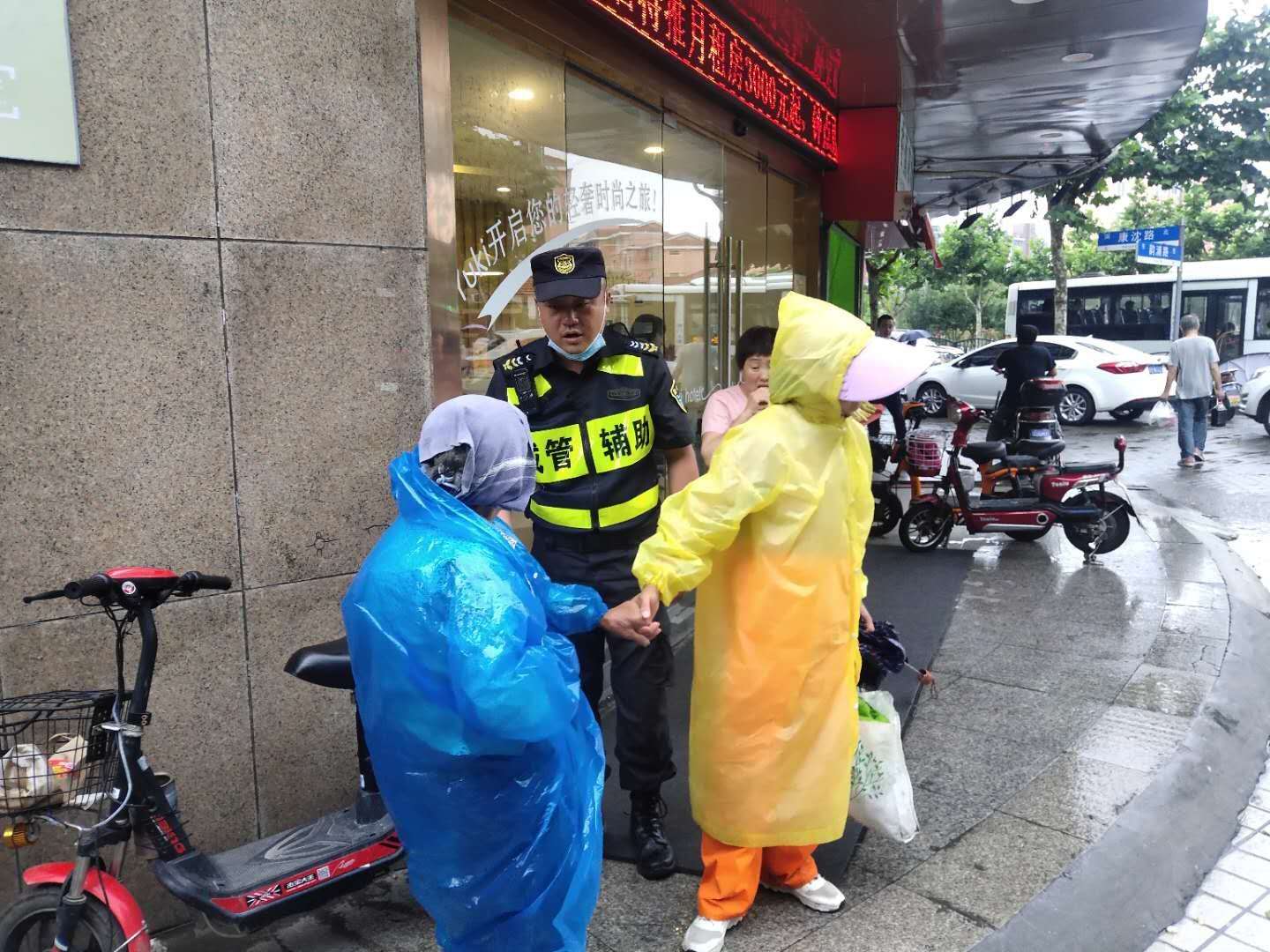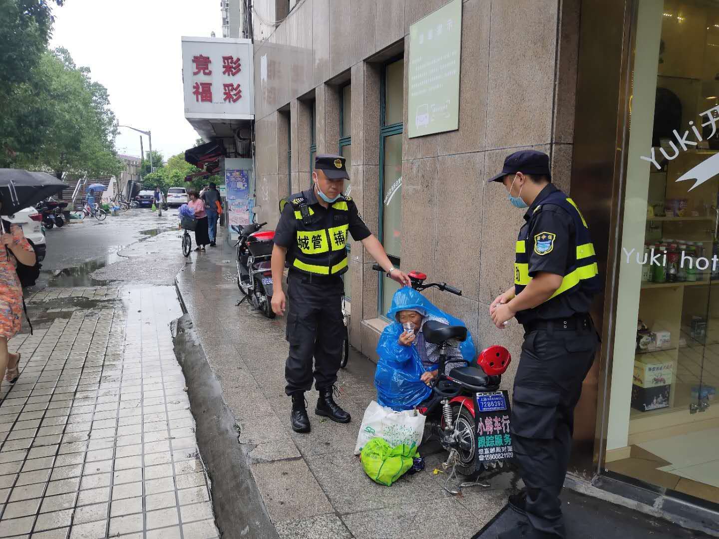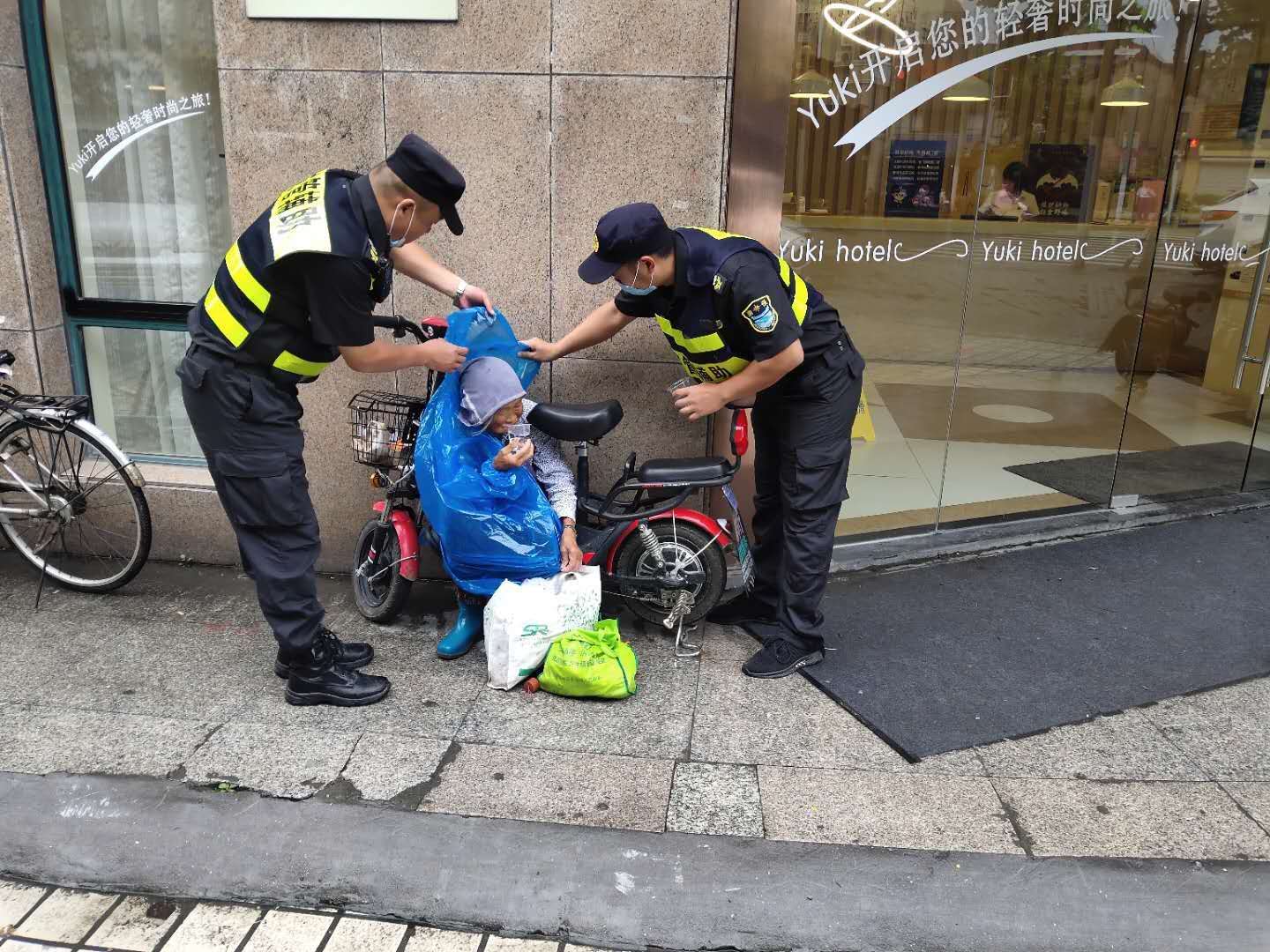 6月29日,宗保公司駐周浦市容項(xiàng)目三組隊(duì)員王明明,巡邏至湯家木橋西側(cè)時(shí),看到一位老人瑟瑟發(fā)抖,蜷縮在勇丞酒店外墻邊。剛下過一場(chǎng)雨,老人沒帶任何雨具,只帶著頭巾,衣服幾乎濕透。這里離菜場(chǎng)很近,過往的人行色匆匆,沒有人多看老人一眼。
