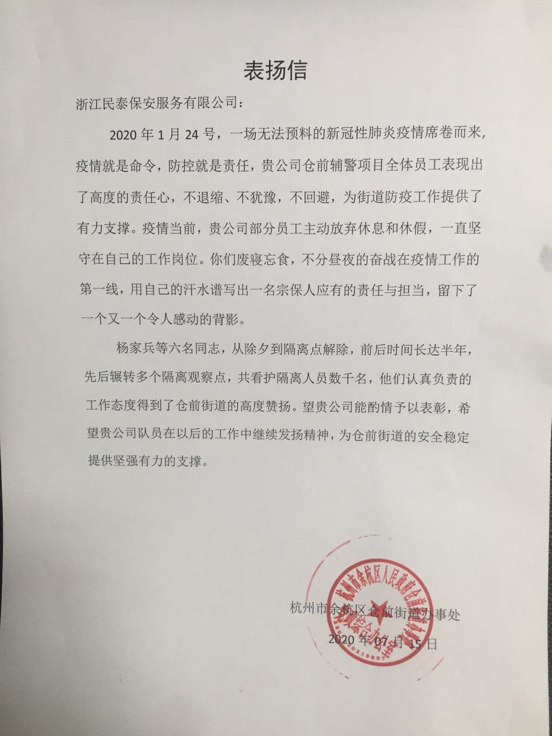 7月15日,浙江民泰駐倉(cāng)前派出所輔警項(xiàng)目收到一封來(lái)自余杭區(qū)倉(cāng)前街道辦事處的表?yè)P(yáng)信,信中對(duì)在疫情防控期間,為倉(cāng)前街道防疫工作提供有力支撐的倉(cāng)前派出所輔警項(xiàng)目提出表?yè)P(yáng)。