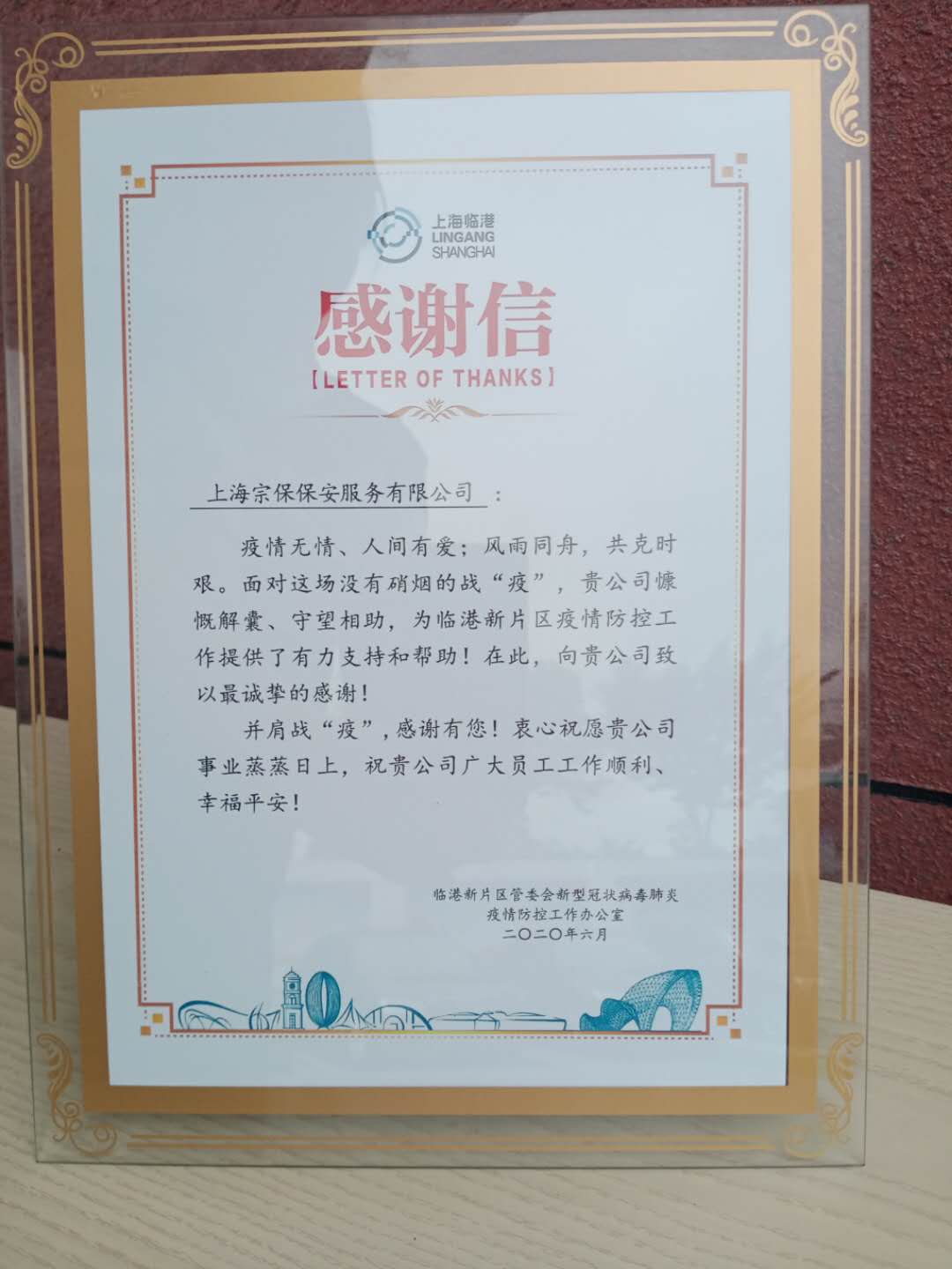 2020年6月份,上海宗保保安服務(wù)有限公司收到一封臨港新片區(qū)管委會新型冠狀病毒肺炎疫情防控工作辦公室的表揚信,信中對公司大力支持臨港新片區(qū)管委會疫情防控工作表示感謝。