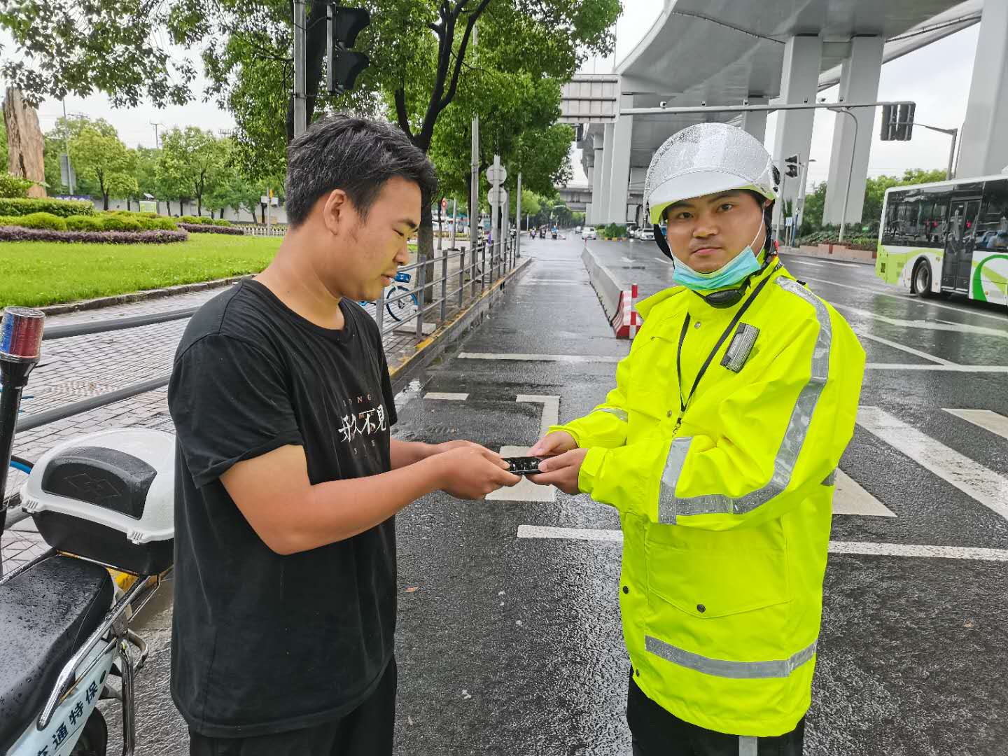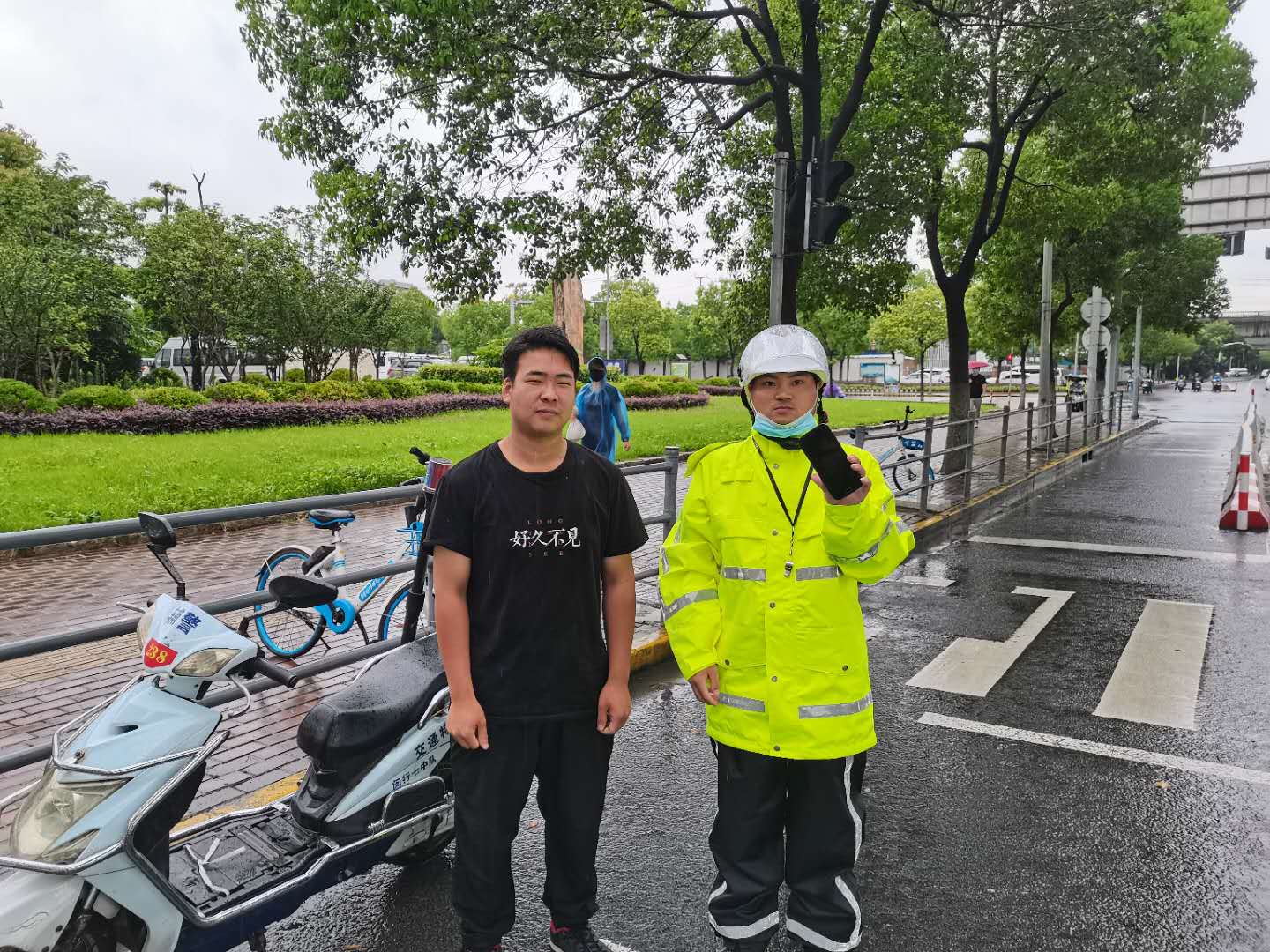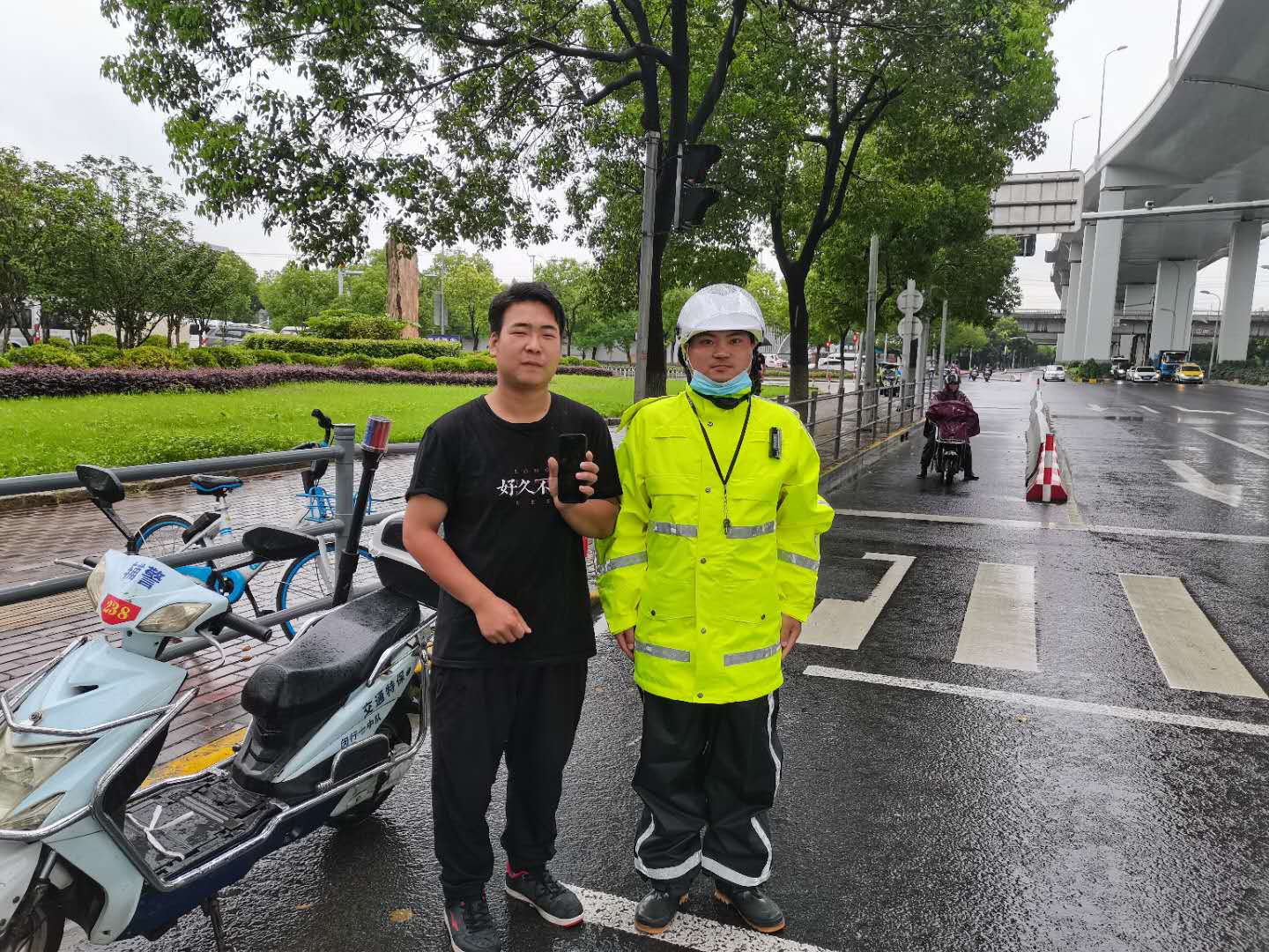 7月15日13:20,宗保公司駐閔行新虹街道項目隊員蔣虎,在天山西路申虹路巡邏時撿到一部手機。 蔣虎第一時間將情況上報項目負責(zé)人,考慮到失主可能沒有走遠,得到指令后在原地等待。10分鐘后,失主打來電話,蔣虎和失主約好見面地點。沒過多久,一位身穿黑色T恤的男士急匆匆地跑過來,經(jīng)核實確認身份后,蔣虎將手機交還失主。失主當(dāng)場對小蔣表示感謝,并主動要求合影。 (供稿人:周鹍)
