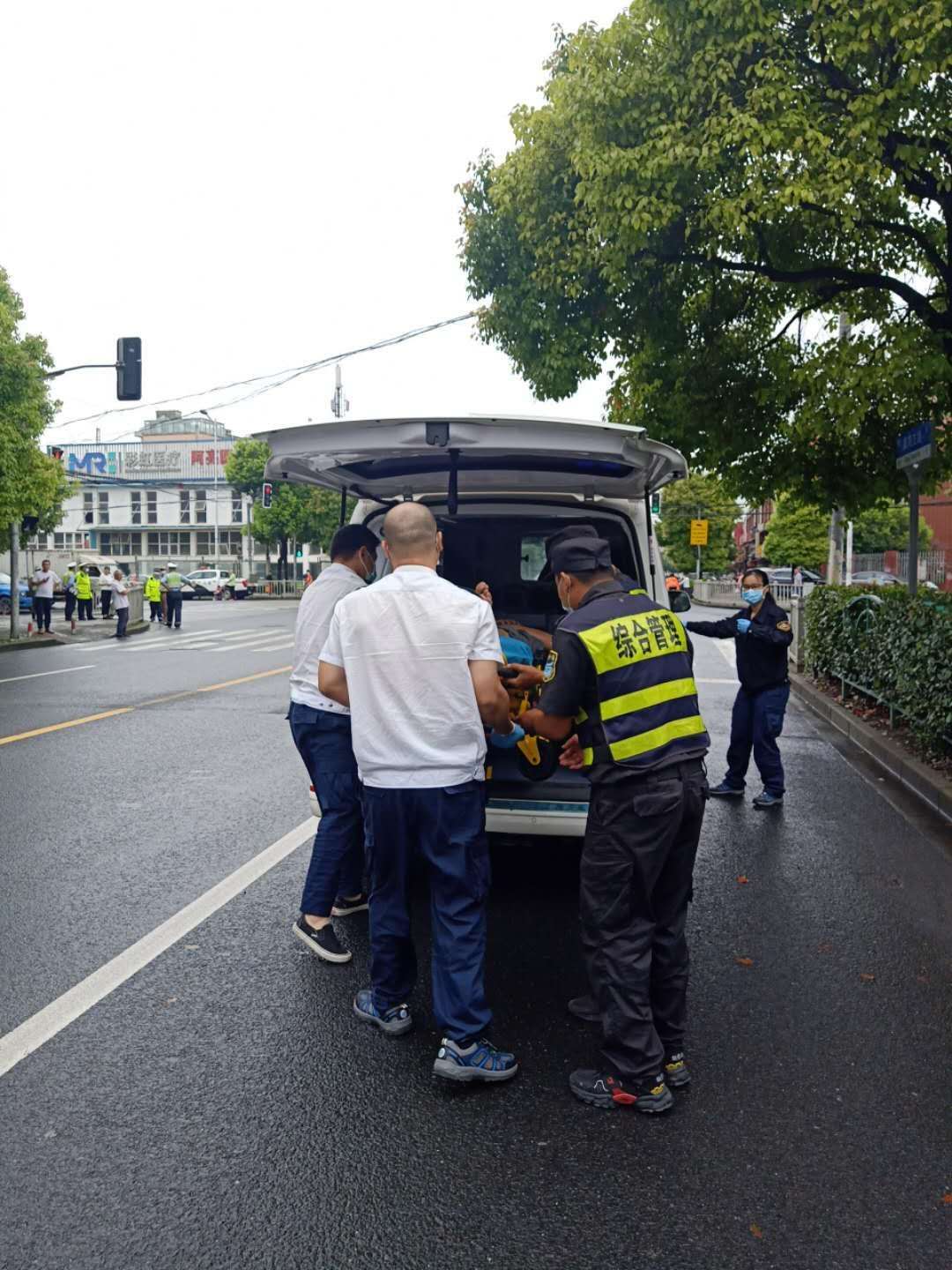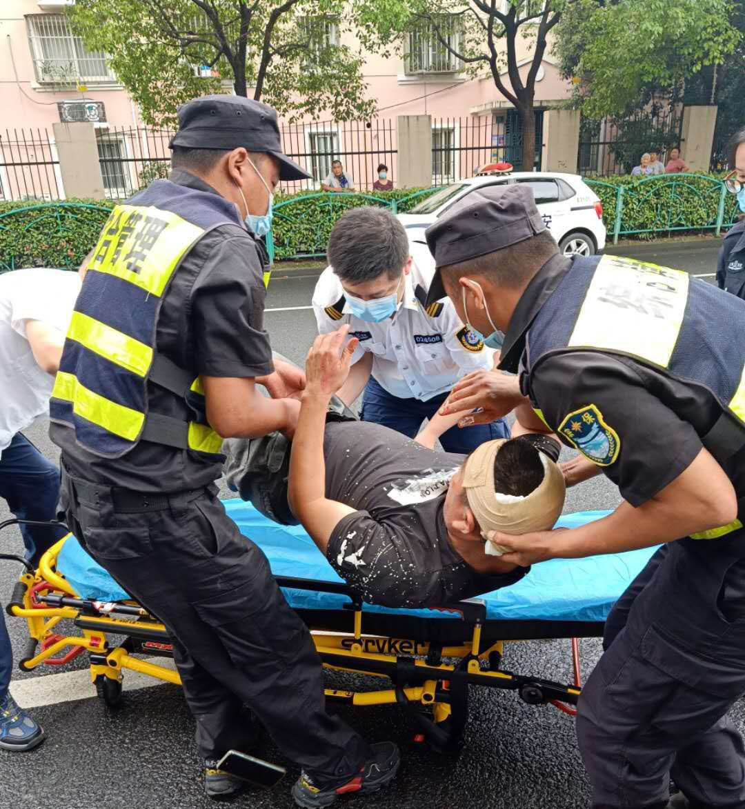 7月16日9:30,宗保公司駐高橋市容項目隊員李旭龍、徐金雷、萬少杰巡邏至草高支路和龍路交叉口時,遇到一名騎電瓶車的男子躺在馬路中間,電瓶車摔倒在一旁,因頭部著地失血過多,已處于昏迷狀態(tài)。