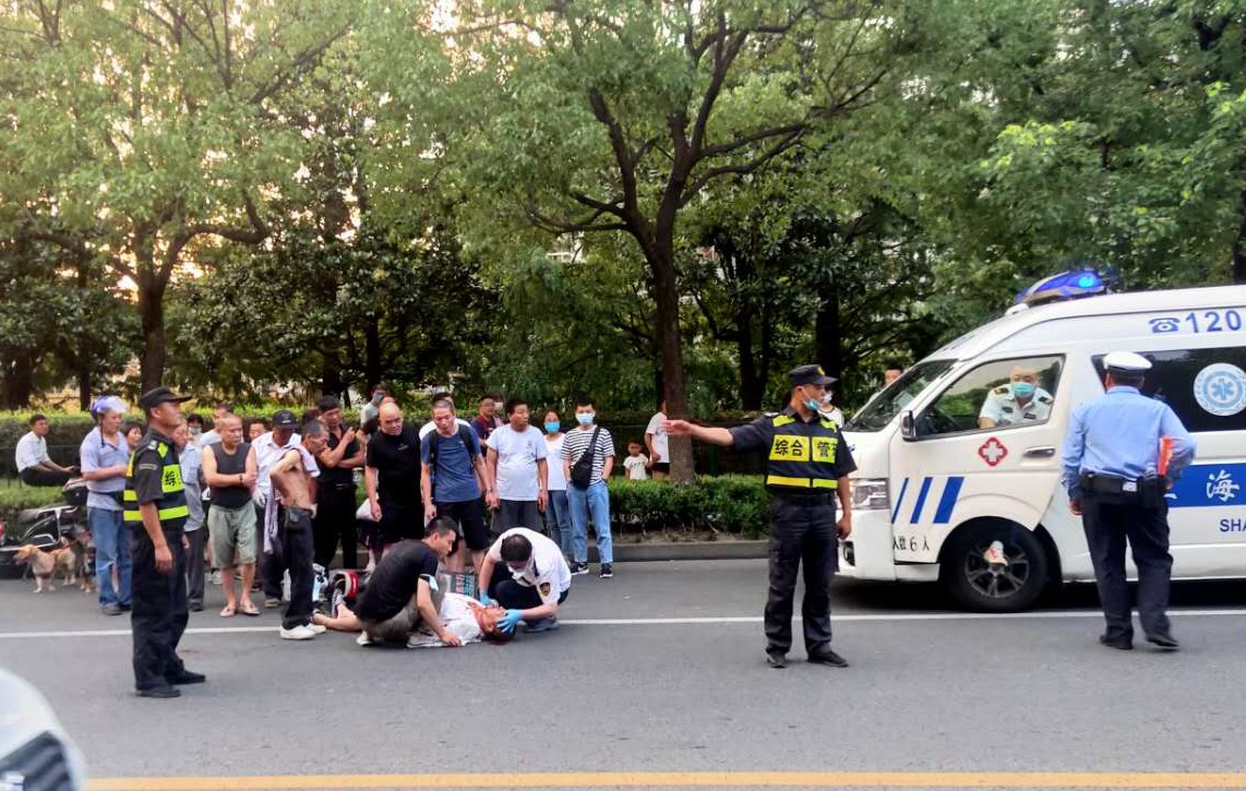7月24日18:30,宗保公司駐三林市容項目隊員張治付等三名隊員巡邏至楊思地鐵1號口東30米時,遇到一起突發(fā)的交通事故。