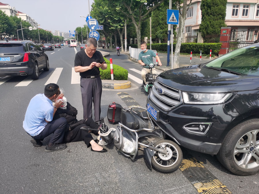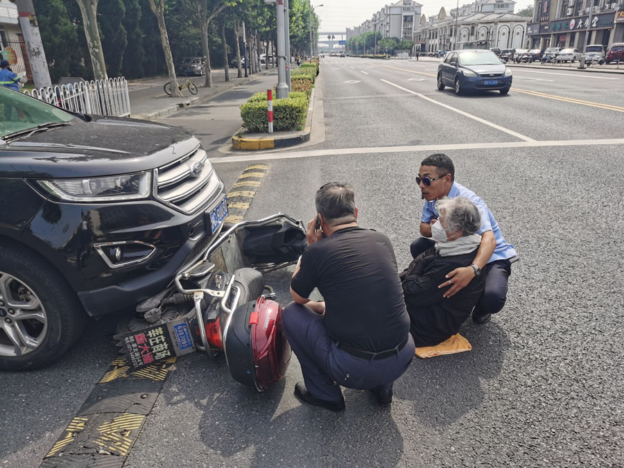 7月22日14時(shí),閔行莘莊梅隴交通輔警鄭德坡和經(jīng)理周鹍經(jīng)過春莘路時(shí),發(fā)現(xiàn)路邊發(fā)生一起交通事故。機(jī)動(dòng)車與非機(jī)動(dòng)車相撞,被撞的老人坐在地上,滿臉是血。兩人見狀迅速調(diào)轉(zhuǎn)車頭,將車在路邊停好后,上前查看老人受傷情況,用手機(jī)拍攝現(xiàn)場(chǎng)照片,一同指揮車輛不要妨礙交通。