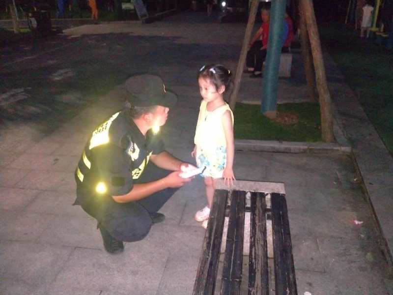 無獨(dú)有偶,當(dāng)日19:36,項(xiàng)錦鐘、馬柯楠兩名隊(duì)員巡邏至橫江公園時(shí),聽到有小孩哭聲,便循聲過去,原來是一個(gè)小孩找不到家人了。隊(duì)員陪小孩在原地等待了大概10分鐘左右,小孩的外婆來到現(xiàn)場將小孩接走。