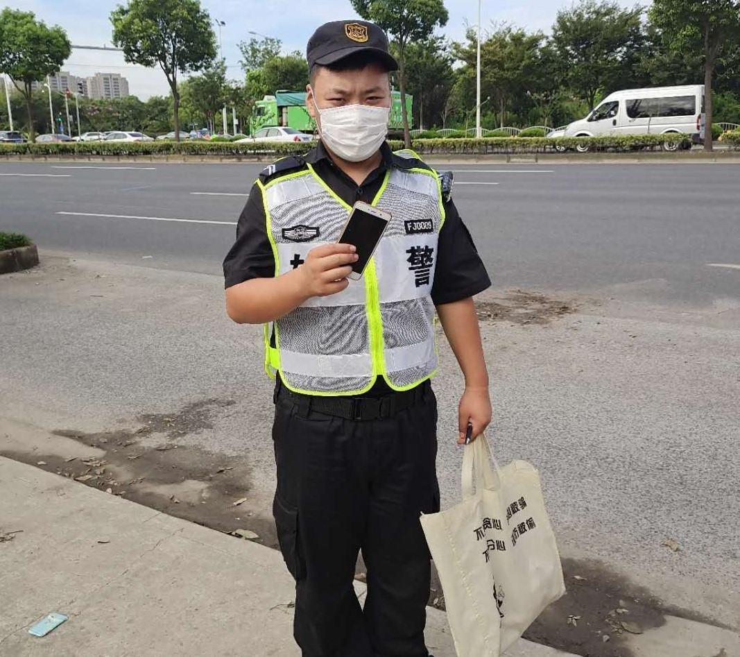 8月7日7時左右,周浦市容輔警項目隊員馬跨越、呂振濤在申江南路周祝公路配合民警進行交通整治時,撿到一部沒有設密碼嶄新的華為手機,第一時間匯報項目。