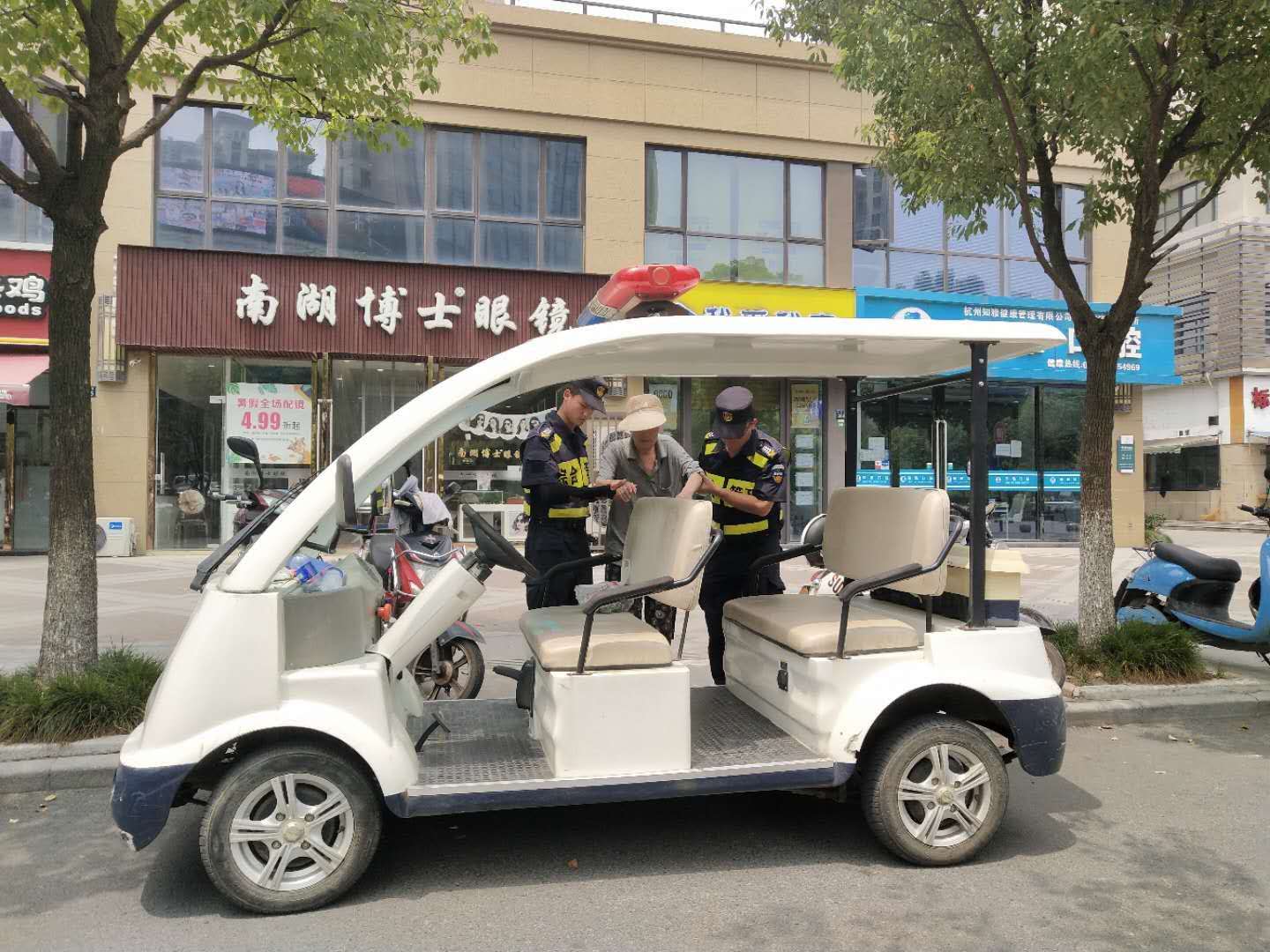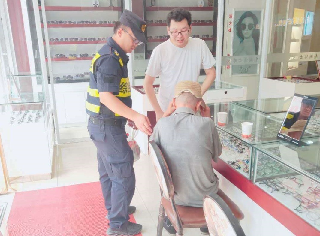 當(dāng)日11:30左右,一位在街道上徘徊了許久的老人,無奈地走進眼鏡店求助。眼鏡店老板見狀安慰老人,這時恰逢巡邏隊員文英杰、徐飛、張侯鵬在路邊巡邏,就向隊員尋求幫助。