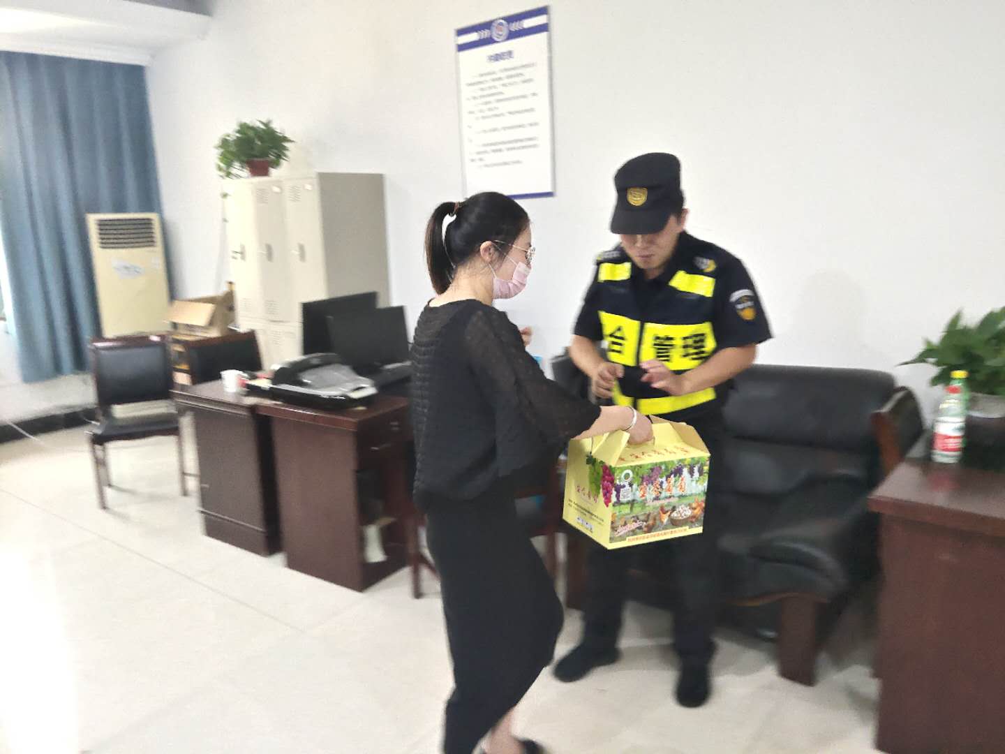 過(guò)了一會(huì),失主急急忙忙趕到中隊(duì),提著一箱葡萄感謝李鑫,被李鑫婉言謝絕,說(shuō)這是自己應(yīng)該做的。待失主檢查好包內(nèi)物品后,再次向李鑫表示感謝。