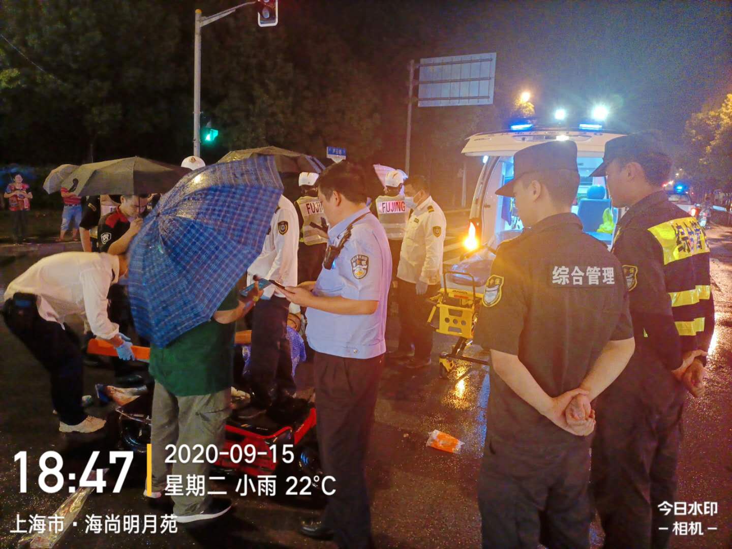 9月15日18:50,細(xì)雨綿綿,蘆潮港市容隊(duì)員侯亞林、劉勇輝冒雨巡邏至港輝路與蘆云路交叉口時(shí),路口處剛發(fā)生一起交通事故,有人員受傷,現(xiàn)場(chǎng)圍觀(guān)群眾較多。