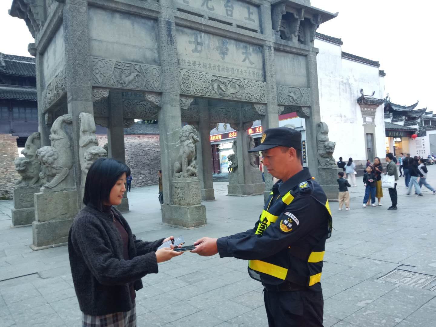 當(dāng)日,歙縣項(xiàng)目隊(duì)員吳超在古城景區(qū)巡邏時(shí)發(fā)現(xiàn)一部遺落在地面的手機(jī),撿起后發(fā)現(xiàn)手機(jī)設(shè)置屏鎖,無(wú)法聯(lián)系失主,便立刻向項(xiàng)目負(fù)責(zé)人報(bào)告,并在原地等待。