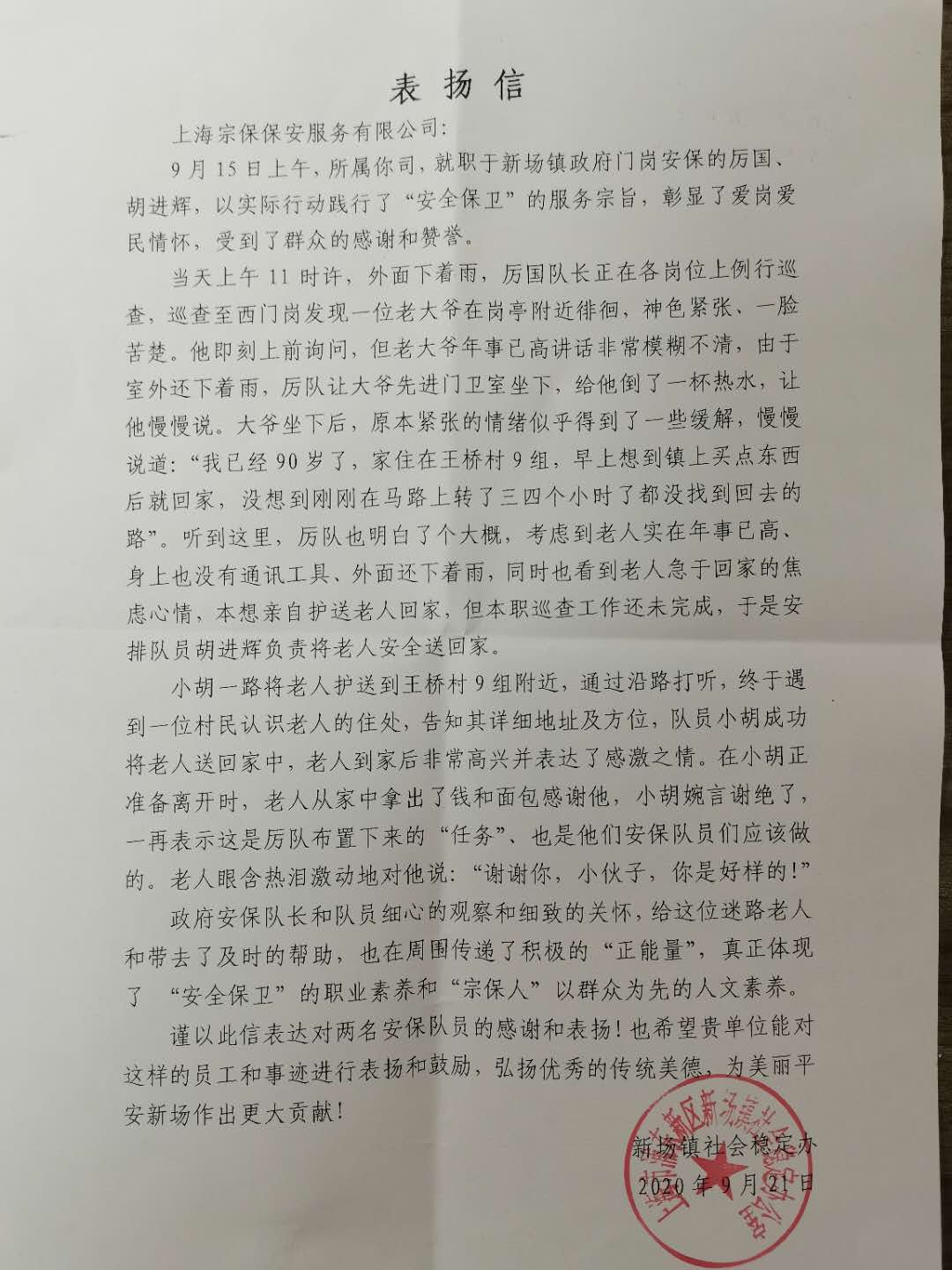 9月15日,宗保公司駐新場鎮(zhèn)政府門衛(wèi)項目隊長厲國將一位迷路老人護(hù)送回家。
