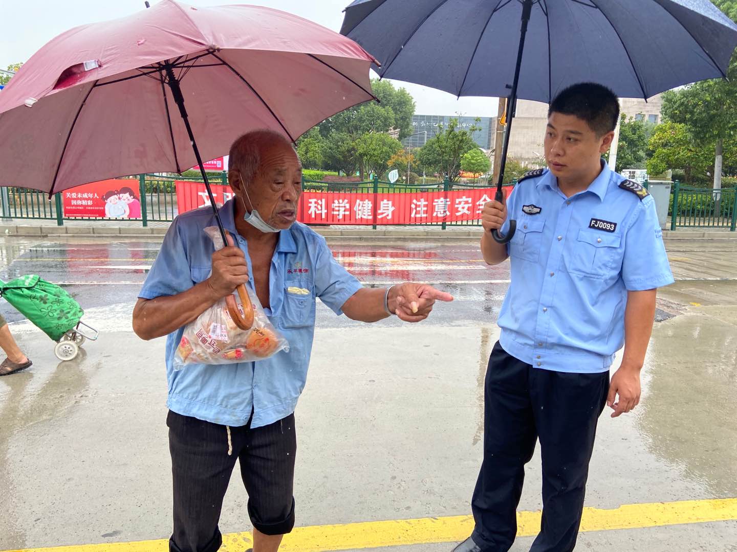 當(dāng)日11:00,厲國在崗位巡查時,發(fā)現(xiàn)一位老大爺在崗?fù)じ浇腔?,神情焦慮,便即刻上前詢問。老大爺年事已高,記不起家人的聯(lián)系電話,身上又沒有帶通訊工具,下雨了急著回家,卻找不到回家的路了。