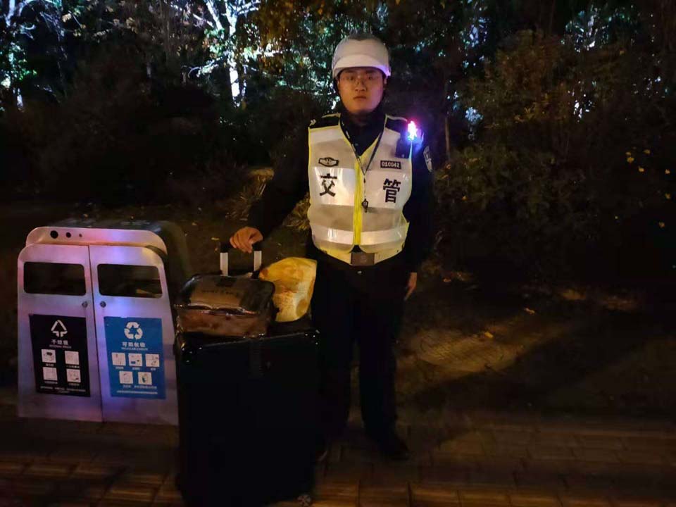 當(dāng)天19:25,宋金峰在滬青平七莘路路口東北角巡邏時(shí)撿到一個(gè)行李箱,考慮到失主丟了行李箱一定很著急,便在原地等待。
