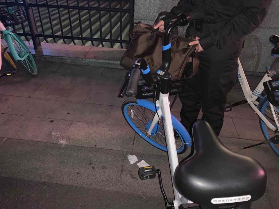 當(dāng)天20:21,許萌、鮑瑞芳和梁月香巡邏至濱江公園汽車餐廳附近時(shí),在共享單車車筐內(nèi)發(fā)現(xiàn)一咖啡色公文包無人認(rèn)領(lǐng),便打開執(zhí)法記錄儀拍照取證,包內(nèi)有一臺(tái)筆記本電腦和一根數(shù)據(jù)線。