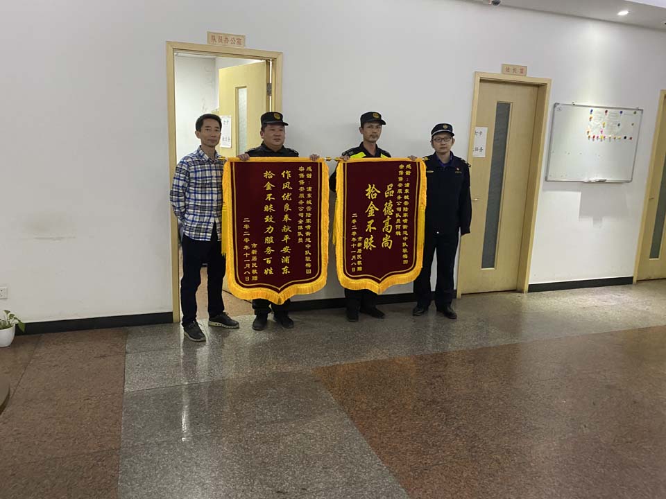 事后,馮先生特地來到陸家嘴街道城管中隊(duì),將繡有“拾金不昧 品德高尚”“拾金不昧致力服務(wù)百姓 作風(fēng)優(yōu)良奉獻(xiàn)平安浦東”的兩面錦旗和一封熱情洋溢的感謝信送到何穩(wěn)手中,以表達(dá)謝意。
