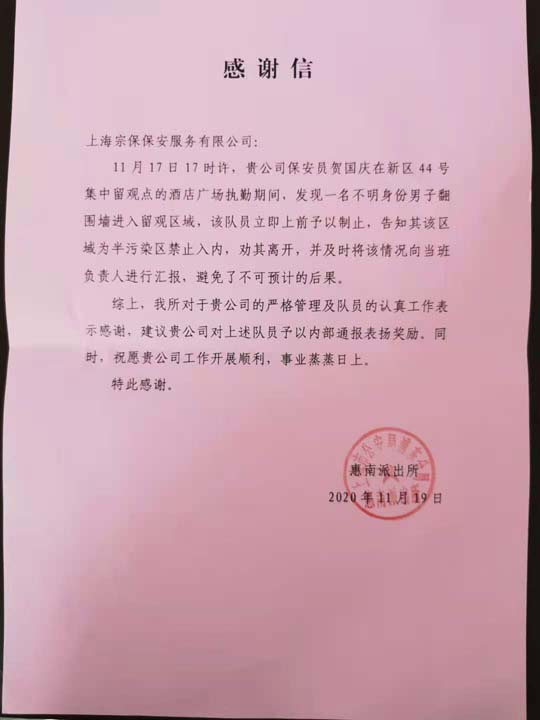 11月19日,浦東新區(qū)公安分局惠南派出所副所長殷昌建將一封感謝信送到公司駐惠南區(qū)域隊員賀國慶手中,對其及時制止一名男子企圖進(jìn)入隔離區(qū)的行為提出表揚(yáng)。